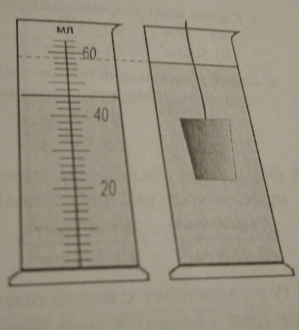 6. В ту же мензурку с водой опуще- но тело (рис. справа). Каков объем воды и тела вместе? А) 48 см. Б) 60 см. В) 58 см, Г) 70 см