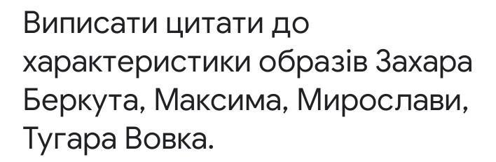 Образ Тугара Вовка: "Був мужчина ,як дуб.Плечистий, підсадкуватий, з грубим чорним волоссям"; "Хоч я лише вовк, дрібна звірюка, то все ще дам раду"; "Тугар був старий вояк і старий ловець.."; та ін.