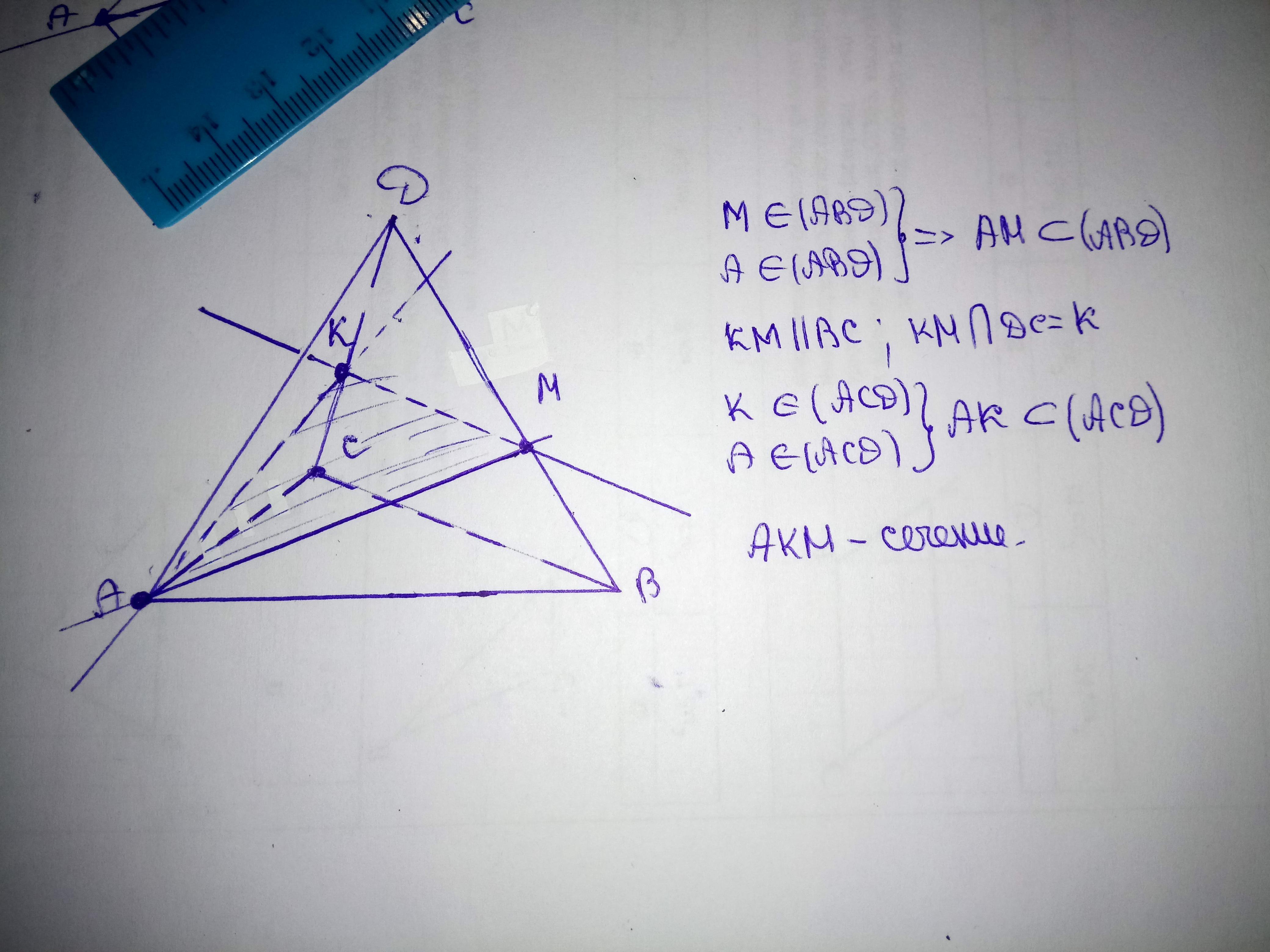2. Изобразите сечение тетраэдра DABC плоскостью, проходящей через точку M пренадлежит DB, вершину А, параллельно прямой BC.