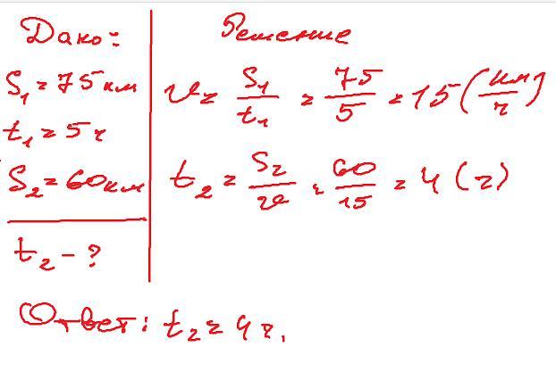 Лыжник за 5 часов прошел 75 км.Сколько времени ему потребуется чтобы с той же скоростью пройти 60 км
