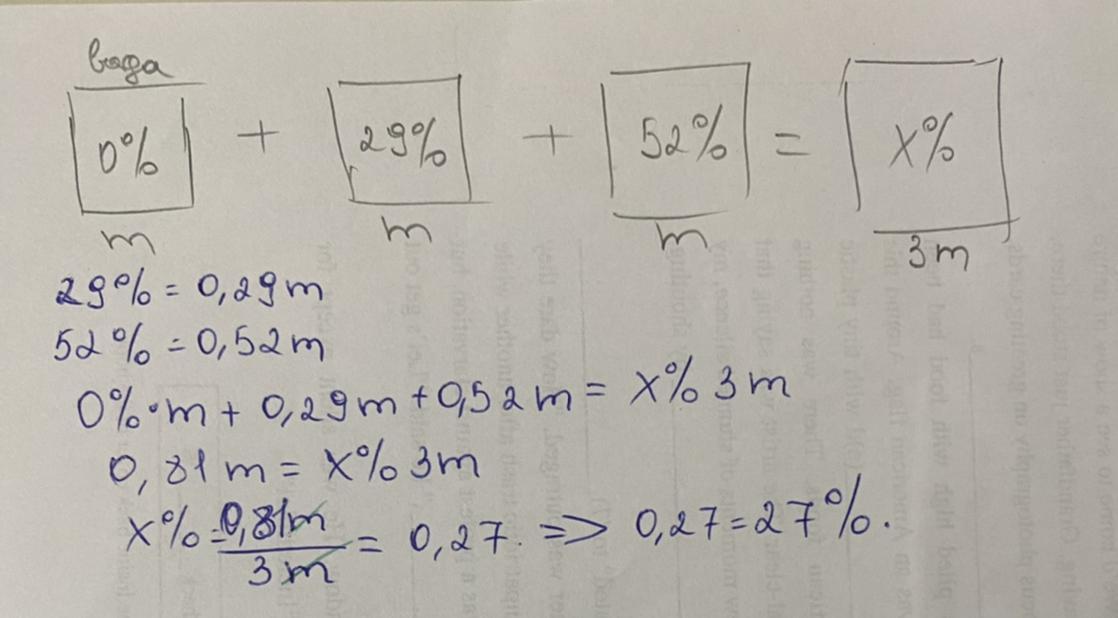 Смешали 3 вещества: воду, 29%-й и 52%-й растворы соли- в равном количестве каждое. Найдите процент соли в полученном растворе