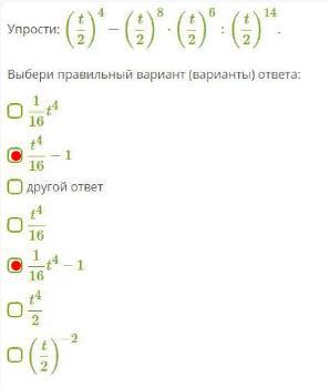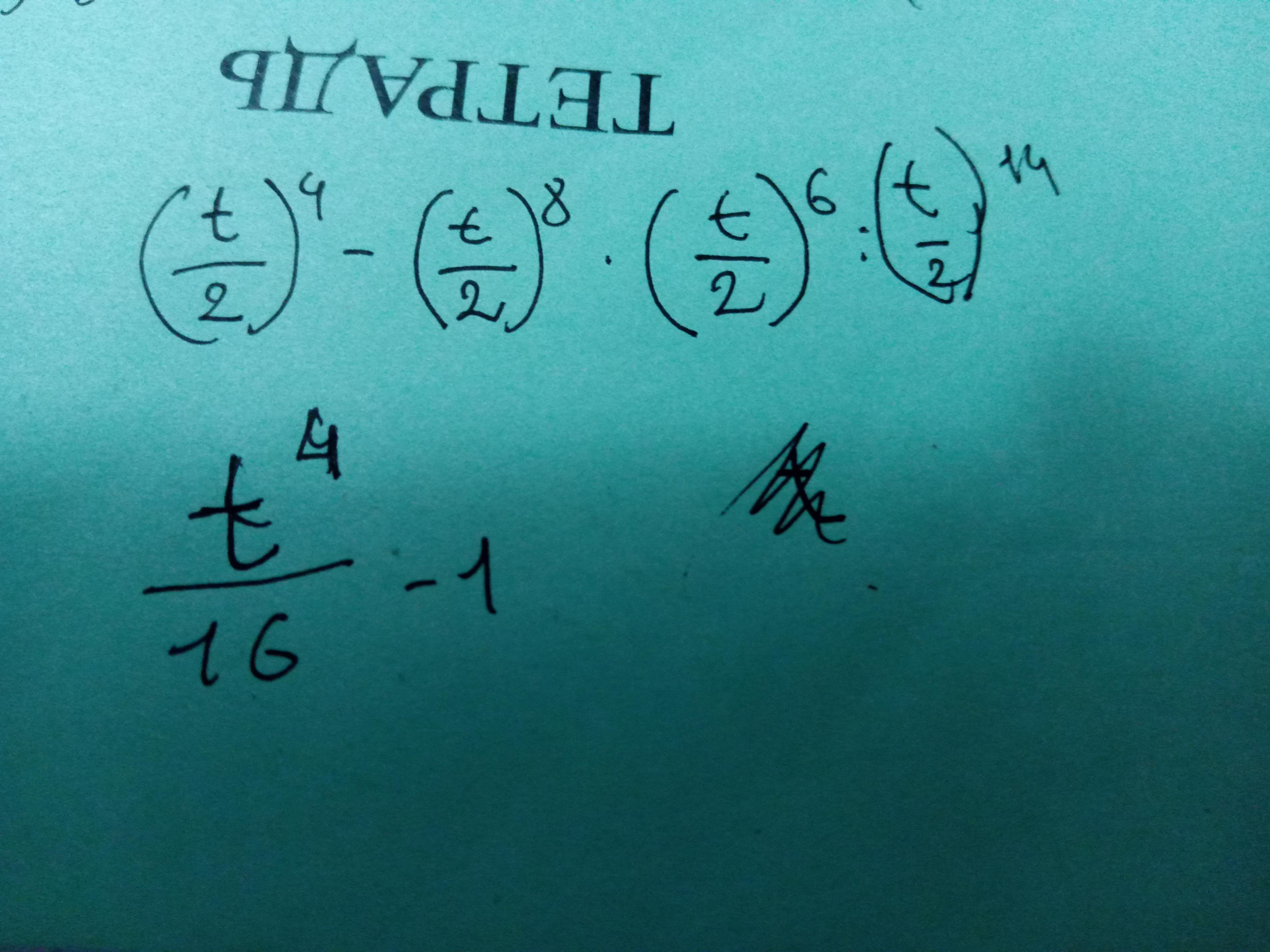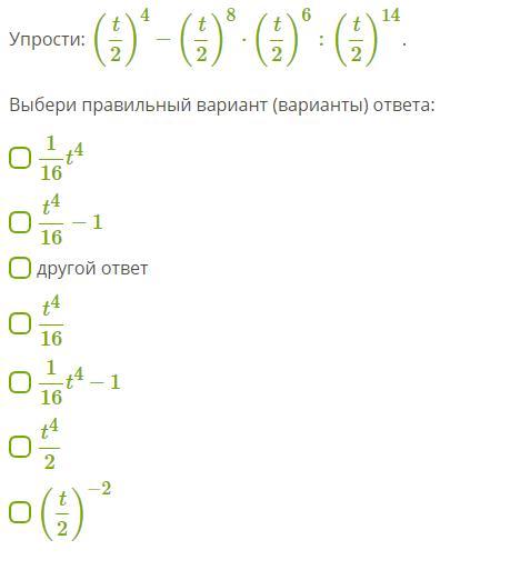 Упрости: (t/2)^4−(t/2)^8⋅(t/2)^6:(t/2)^14.