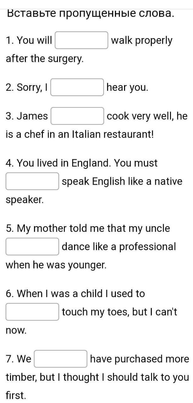 Вставьте пропущенные слова. 1. You will... walk properly after the surgery. 2. Sorry, l ... hear you.