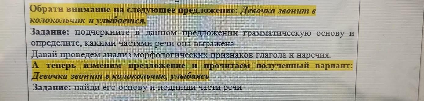 *Девочка(подлежащее-сущ) звонит(сказуемое-глагол =) в колокольчик, улыбаясь.