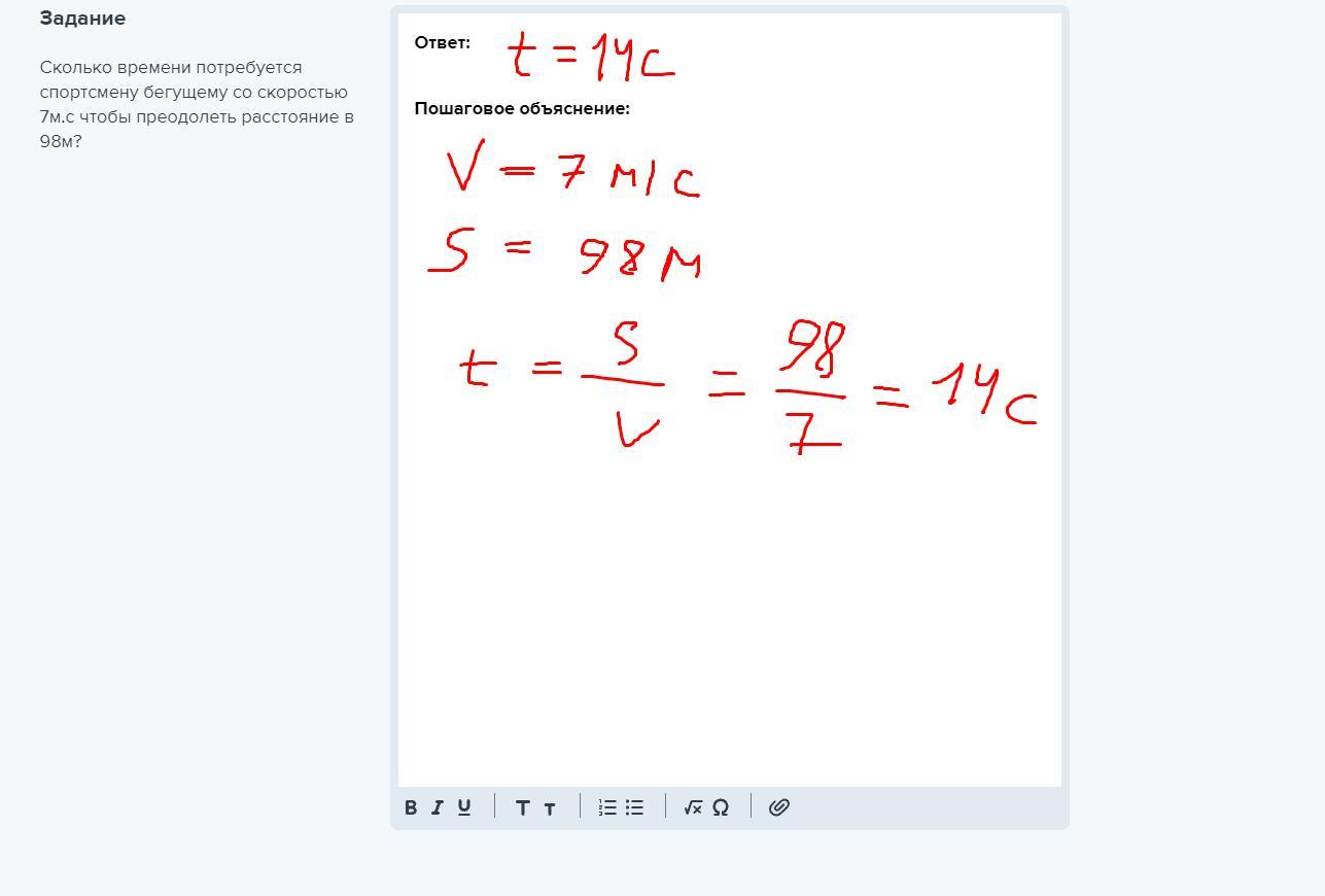 Сколько времени потребуется спортсмену бегущему со скоростью 7м.с чтобы преодолеть расстояние в 98м?