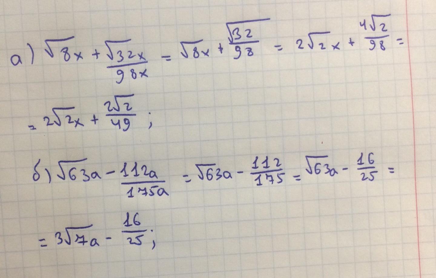1) Упростите выражение: а) √8x + √32x /98x; 6) √63а - 112а +/175а