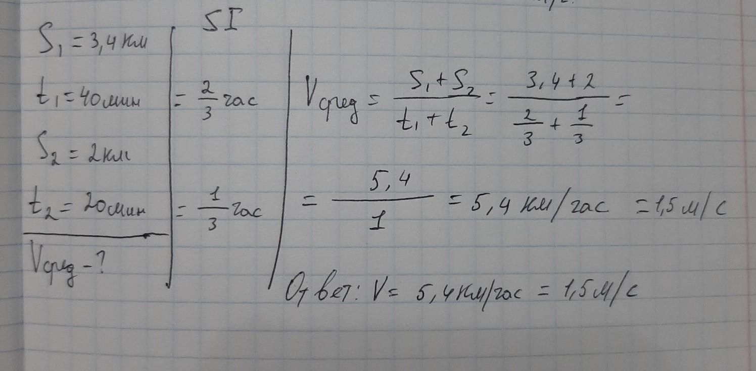 Пешеход прошёл пешком первые 3,4 км пути за 40 минут , а следующие 2 км за 20 мин . Какова средняя скорость пешехода