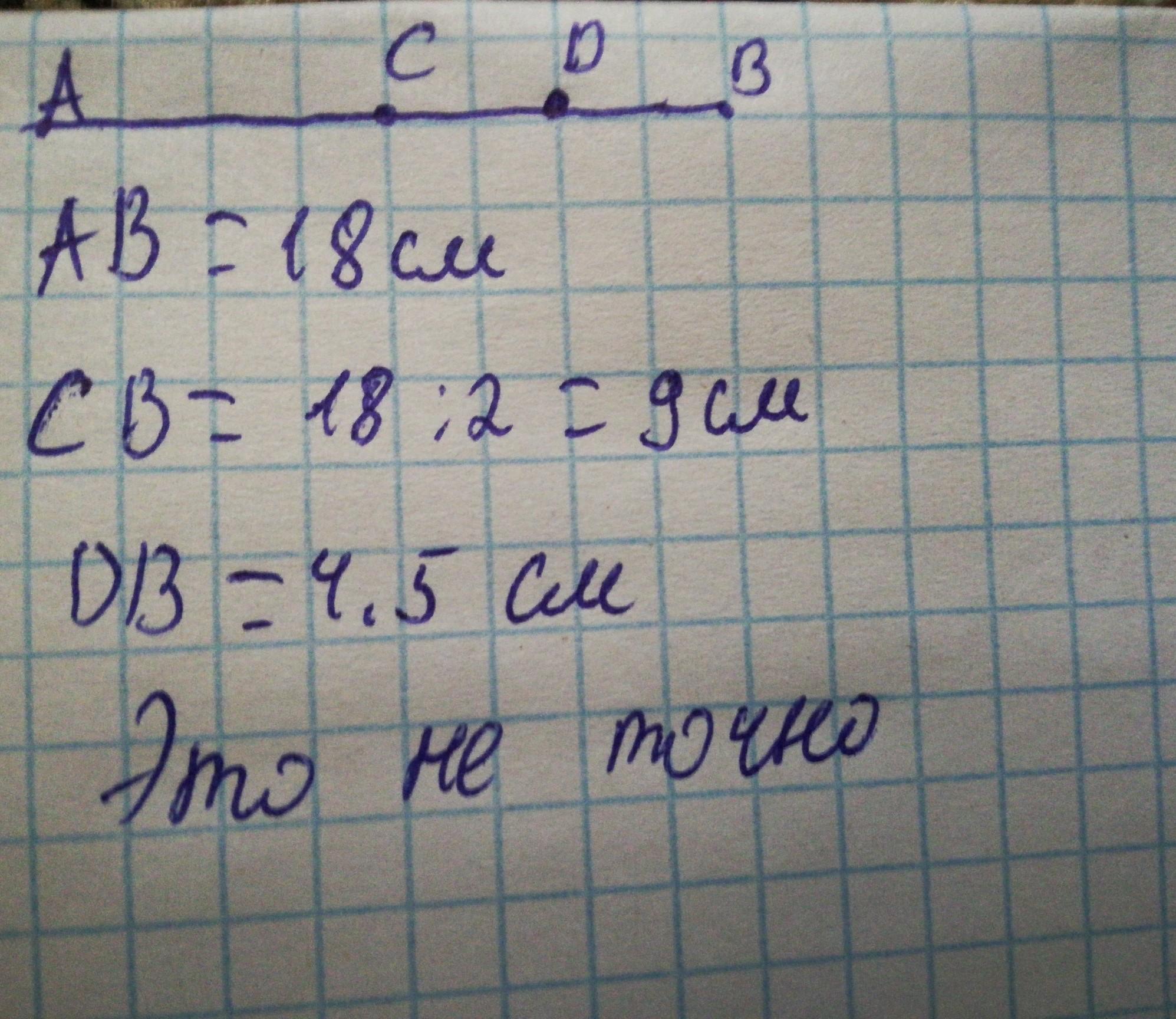 Срочнооо!!! Даю 50 баллов. Точка С - середина отрезка АВ, равного 18 см, а точка D - середина отрезка СВ. Чему равна длина отрезка DB?