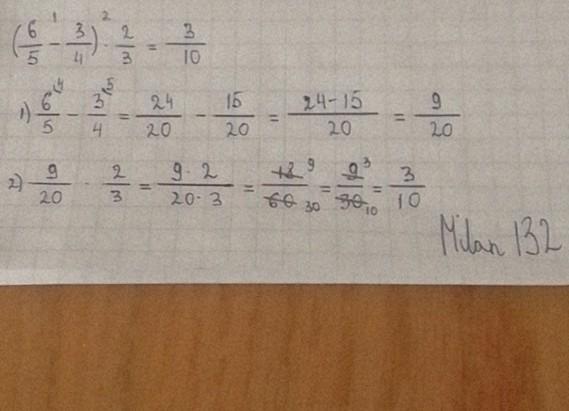 (6/5-3/4)*2/3=((30-15)/20)*2/3=(15/20)*2/3=3/4*2/3=6/12=1/2