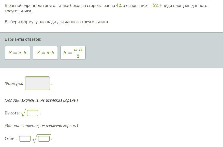 В равнобедренном треугольнике боковая сторона равна 42, а основание — 52. Найди площадь данного треугольника.