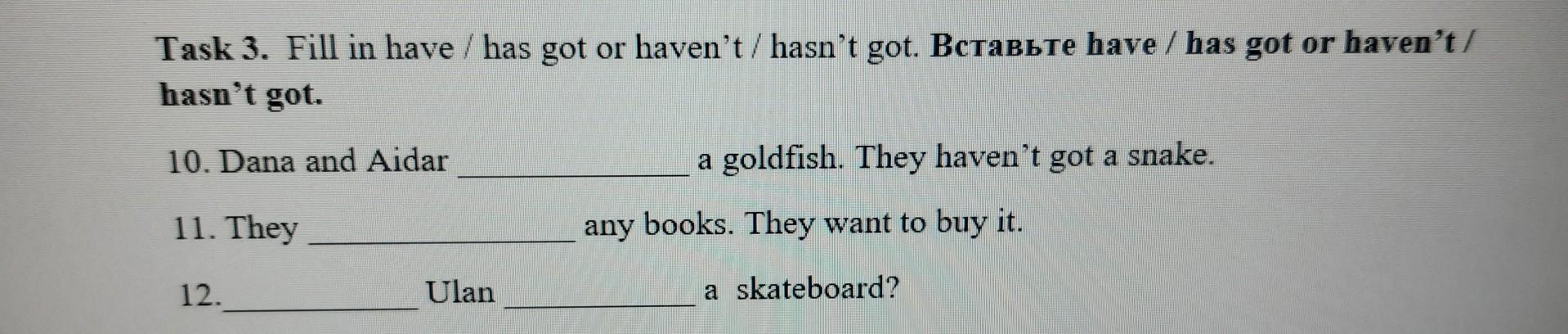 10. Dana and Aidar _______ a goldfish. They haven't got a snake.