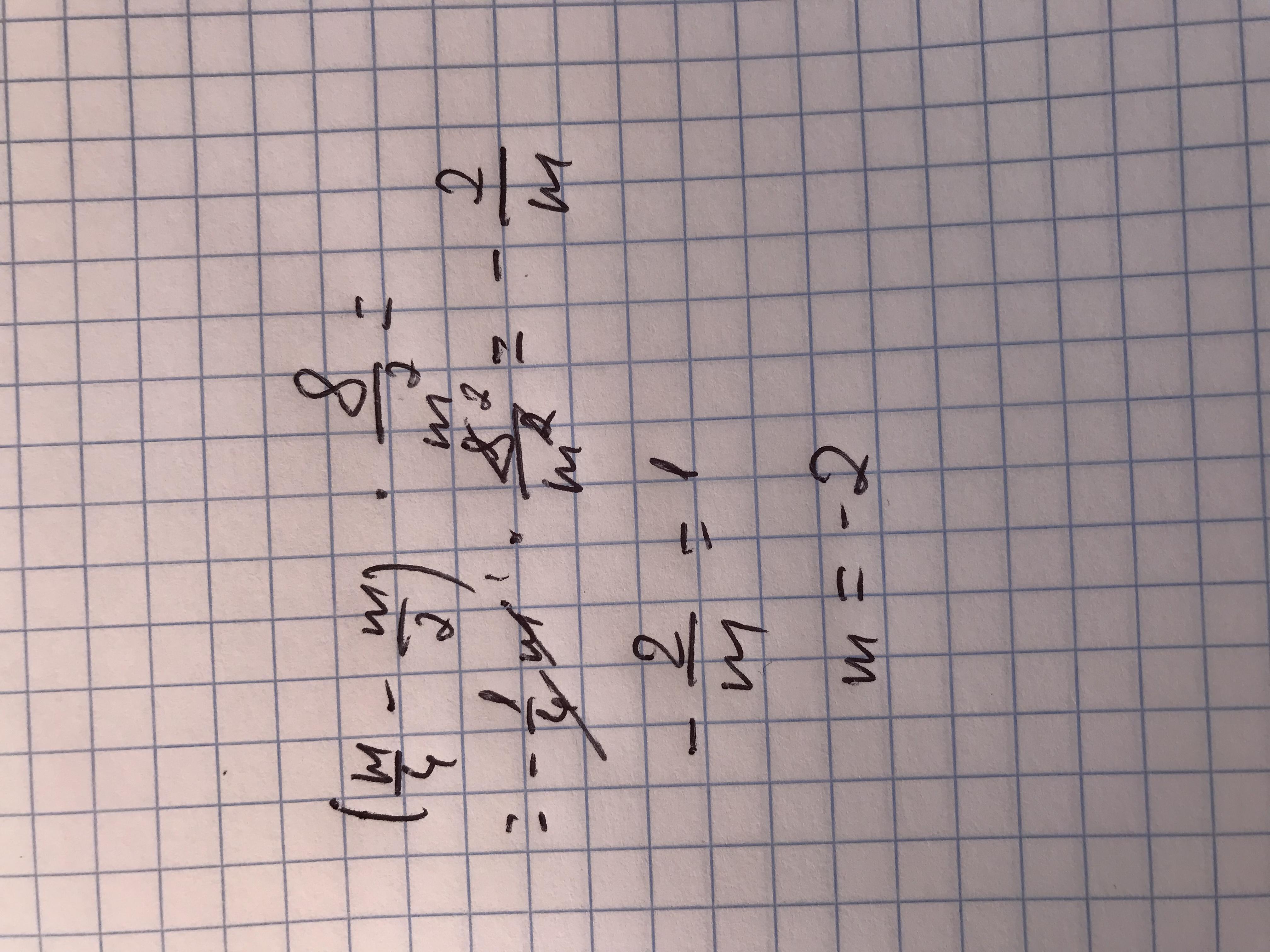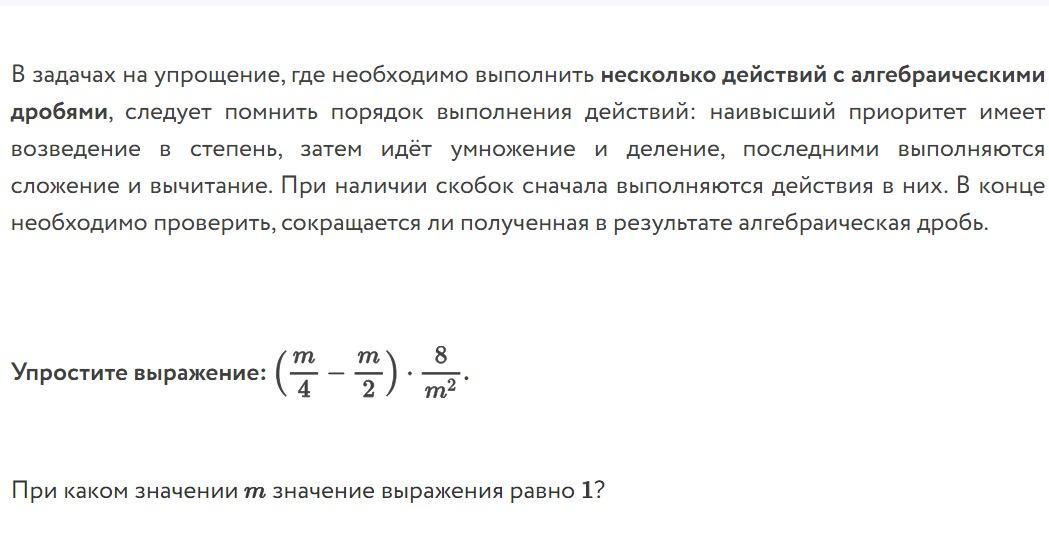 Сведём в скобках к общему знаменателю 4: (m/4 - 2m/4) *8/m² = -m/4 * 8/m². Сократим 8 и 4, m и m²: -2/m.