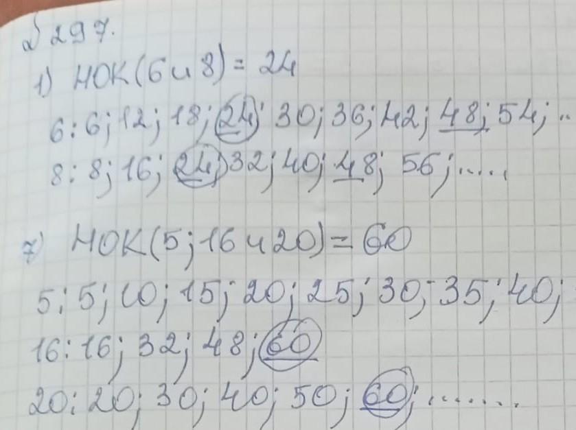 297. Найдите наименьшее общее кратное чисел удобным способом: 1) 6 и 8; 4) 5 и 15; 7) 5, 16 и 20; 2) 4 и 7; 5) 6 и 10; 8) 15, 30 y 45; 3) 9 и 15; 6) 12 и 20; 9) 10, 14 и 35.