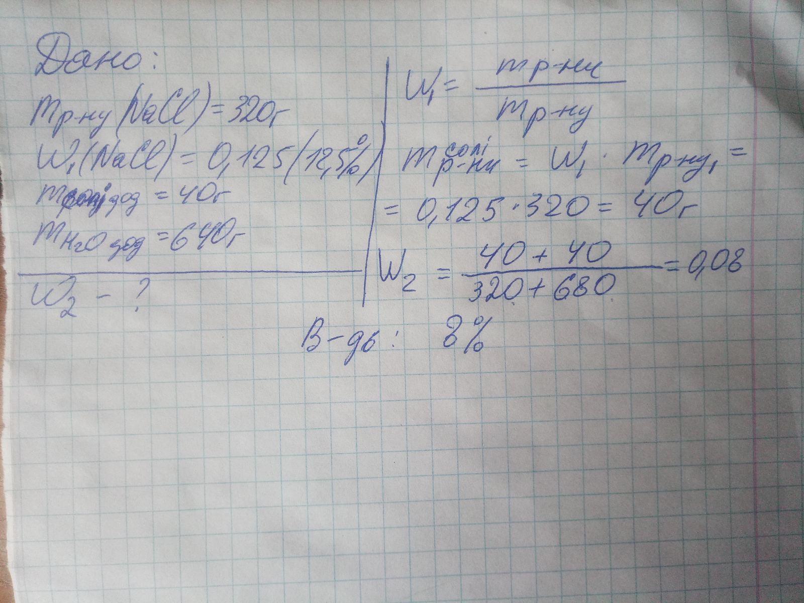 До озчину натрій хлориду масою 320 г з масовою часткою солі 0,125 додали 40 г цієї солі та долили 640 г води. Обчисліть масову частку (%) солі утвореному розчині