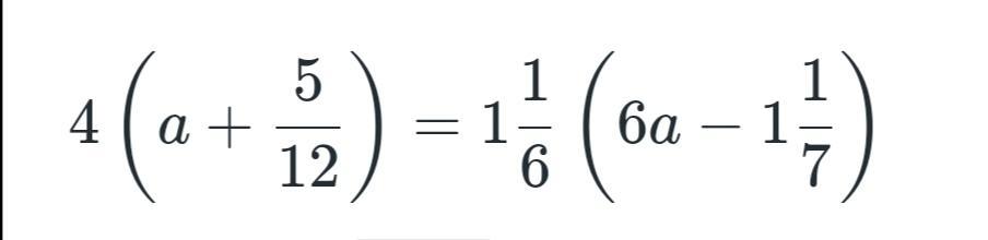 4a+\frac{5}{3} =\frac{7}{6} (6a-\frac{8}{7} )\\4a+\frac{5}{3} =7a-\frac{4}{3} \\4a-7a=-\frac{4}{3} -\frac{5}{3} \\-3a=-3\\a=1