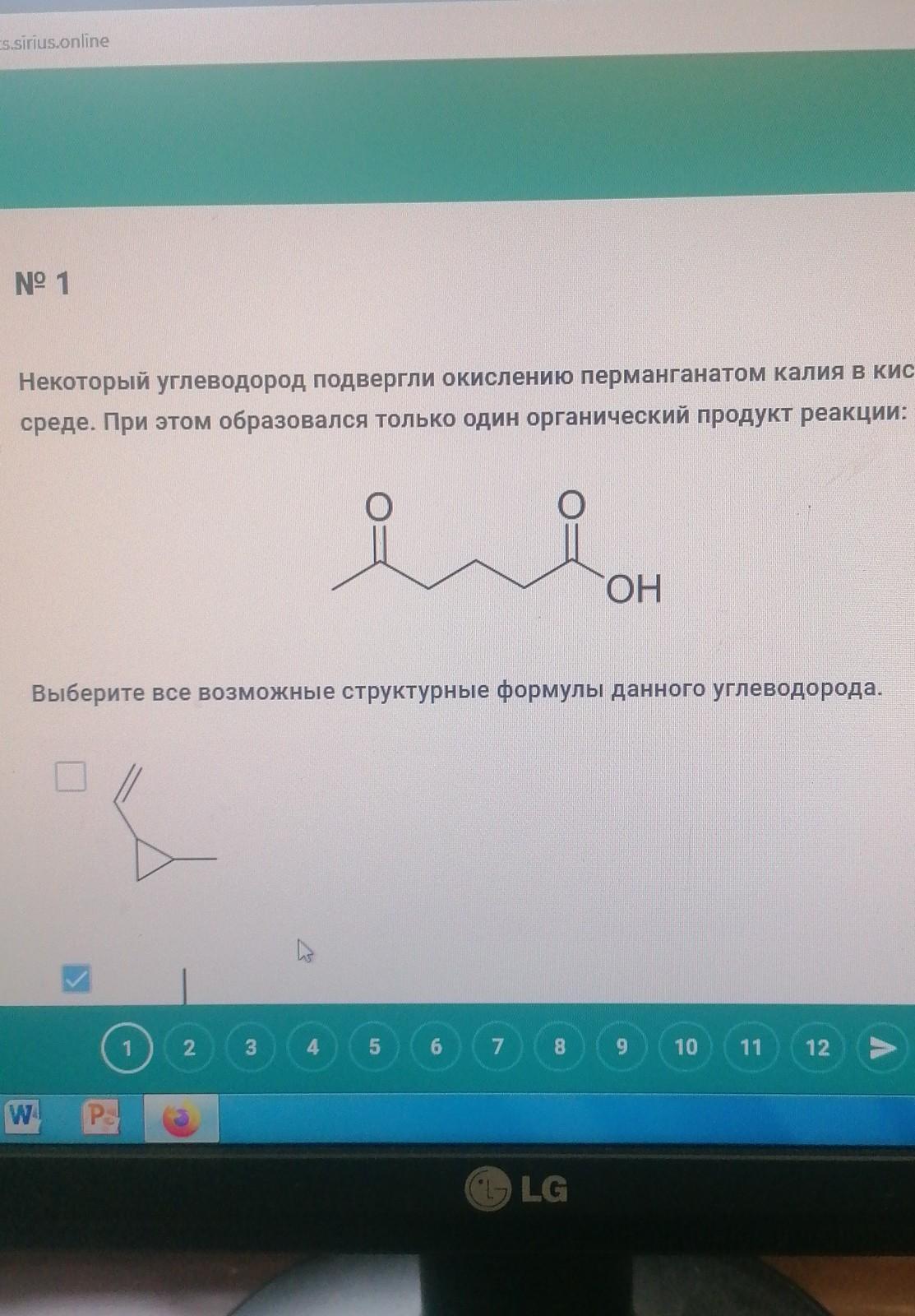 Ne 1 Некоторый углеводород подвергли окислению перманганатом калия в кислой среде. При этом образовался только один органический продукт реакции: о О ОН Выберите все возможные структурные формулы данного углеводорода.