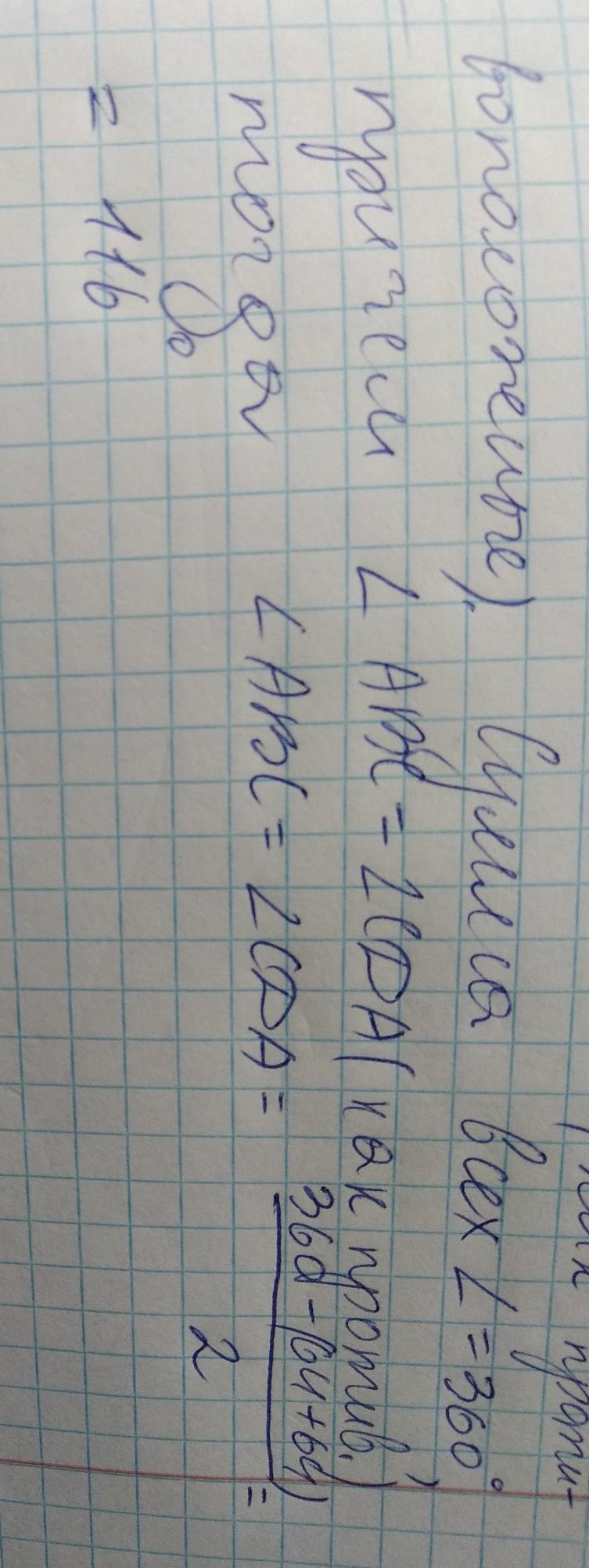 360°-(64°+64°)=232°(сума двох iншiх рiвних кутiв), тобто кожен з них 232/2=116°
