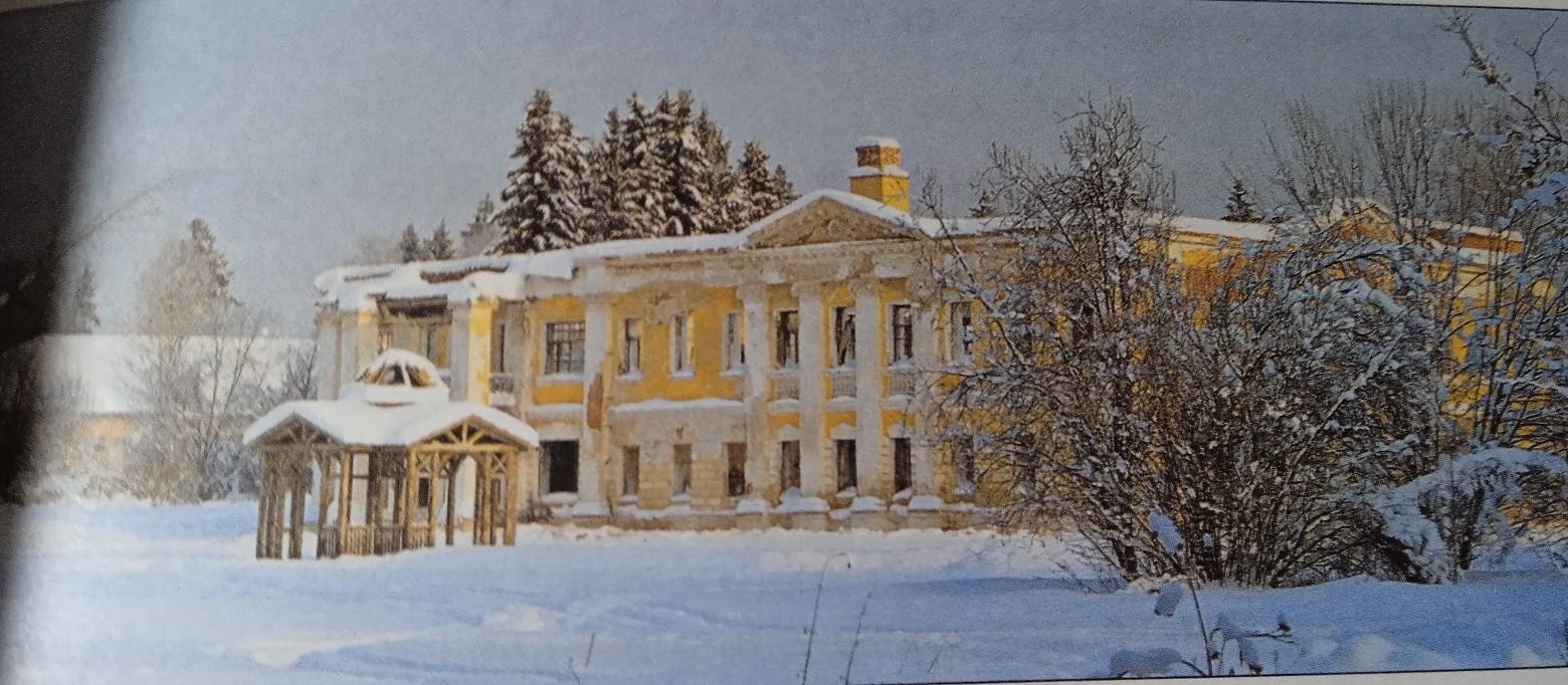 На картине изображено здание,которое покрыто,белым,пушистым снегом.На улице стоит зима и уже начинает темнеть или наоборот только рассветать.Вся земля покрыта сугробами.Само здание окружают пустые,голые деревья.Здание довольно длинное,скорее всего это музей.Музей окрашен в желто-золотистый цвет.У входа здания стоят колонны,которые украшают здание.А перед зданием стоит маленькая,деревянная беседка.
