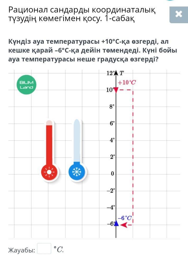 : Днем температура воздуха повысилась до + 10 ° С, а вечером опустилась до -6 ° С. На сколько градусов изменилась температура за день? Ответ ° C.