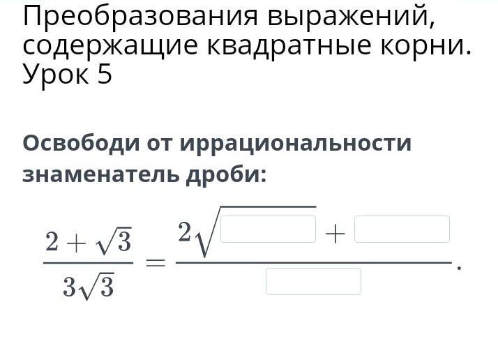 Преобразования выражений, содержащие квадратные корни. Урок 5 Освободи от иррациональности знаменатель дроби: + 2 + 3 2 33 Помогите пожалуйста