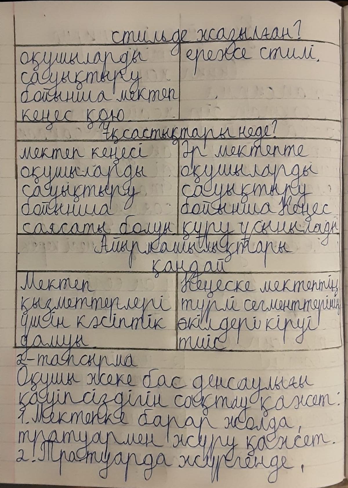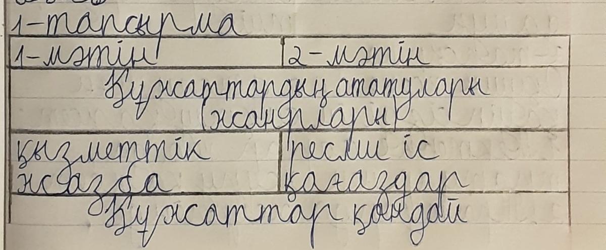 Тапсырма 1. Мәтіндерді окып , оларды салыстырыңыз . 1 - MƏTİH озара кұрылымы мен ресiмделуi тұрғысынан Сауыктыру орнына жiберу туралы қызметтік жазба 1 - мәтiн Қызметтiк жазба Мен , есеп және талдау бөлiмiнiң бас маманы Негербекова Мадина Серікбаевна , денсаулык жагдайымды оңалту және сауықтыру максатында Туркістан облысы , Мақтаарал ауданы , Сарыагаш каласынын « Сарыагаш >> емдік сауықтыру орталығына 2019 аралығында ЖШС каражаты жылгы << _ 11 _ » > казаннан бастап 2020 жылғы 21 >> казан есебiнен енбек демалысына жiберуiнiздi сұраймын . << Номад >> ЖШС директоры A.C. Терекуловка Есеп және талдау белiмiнiң бас маманы М.С : Негербековадан 2 - МЕТIН Нұскаулык 1. Окушыларды сауықтыру бойынша мектеп бағдарламасын әзірлеу 1.1 . Окушыларды сауықтыру бойынша Мектеп Кенесін кұру.Әр мектепте окушыларды сауықтыру бойынша Кеңес кұру ұсынылады . Кеңес - окушыларды сауықтыру бойынша мектеп багдарламасын кұруга жауапты топ . Кенеске мектептiн турлi сегменттерiнiн екiлдерi кiруi тиiс , онын iшiнде , денсаулық сақтау саласынын және дене шыныктыру мұғалімдері , тамактану кызметiнiн кызметкерлерi , окушылар , окушылардың ата - аналары , мектеп басшылығы , және мектеп мейірбикелері . Мектеп Кенесi ай сайын жиналуы тиіс . Оқушыларды сауықтыру бойынша Мектеп Кеңесі оқушыларды сауықтыру бойынша мектеп бағдарламасының саясатын , тәжірибелік кызметін және қорын баскару үшін Үйлестiрушiнi сайл сайлауы тиіс . Кеңес Үйлестiрушiсiнiң кызметі : • Окушылардың денсаулығы мен кауiпсiздiгiне жауапты мектеп кызметкерлерінің бірлескен жұмысына септестiк ету ; . wana Аудандарда және баска мектептерде денсаулық сақтау және кауiпсiздiк багдарламасына жауапты тұлғалар мен мектептің арасындағы байланыс құралы ретінде болу ; МӘСЕ • денсаулык сактау және кауiпсiздiк саласындагы басымдылыктар туралы мектеп директорына , кызметкерлерге , ата - аналарға және оқушыларға хабарлау ; AUTO KLIM • • мектептегi денсаулық сақтау және кауiпсiздiк саласындағы қызметті колдау үшін сенiмдi каржыландыруда ( субсидия алу ) немесе баска кормен камтамасыз етуге көмектесу ; ыру бойынша мектеп бағдарламасының материалдық қорын басқару ; • сауықтыру • мектептегі денсаулык сактау және кауiпсiздiк саласынын материалдарын дамытуда , сондай - ак , оку материалдарын тандауда септестік ету ; • Окушыларды сауықтыру бойынша Мектеп Кенесін ұйымдастыру және өткізу ; • Мектеп кызмектерлерi үшiн кәсіптік даму бағдарламасын енгізуге септестік ету Құжаттардын ататулары ( жанрлары ) Негербекова 05.10.2019ж 2 - мәтiнКұжаттар қандай стильде жазылған ? Ұқсастықтары неде ? Айырмашылықтары қандай ?