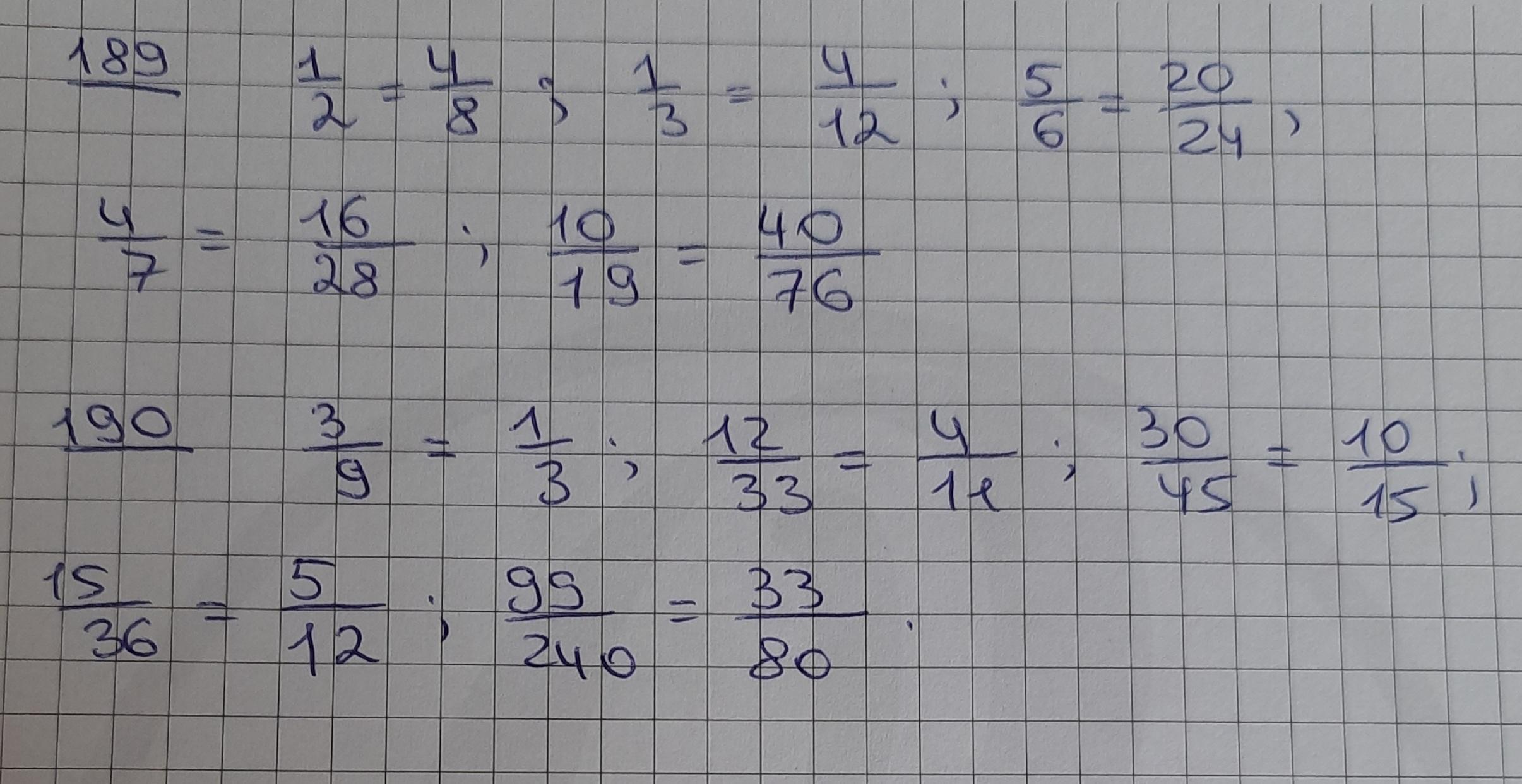 в номере 190 аналогично, если делить числитель и знаменатель на одно число, то дробь не изменится, просто данные нам дроби можно сократить( найти общий множитель, на который делится и числитель и знаменатель)