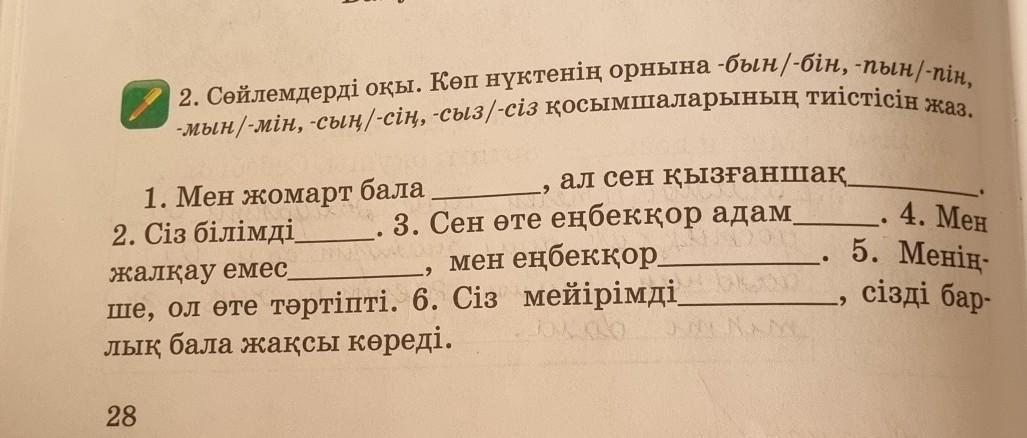2. Сөйлемдерді оқы. Көп нүктенің орнына -бын/-бiн, -пын/-niн, -мын/-мін, -сың7-сің, -сыз/ -сіз қосымшаларының тиістісін жаз. 1. Мен жомарт бала ал сен қызғаншақ, 2. Сіз білімді 3. Сен өте еңбекқор адам жалқау емес мен еңбекқор, ше, ол өте тәртіпті. 6. Сіз мейірімді лық бала жақсы көреді. 10 4. Мен 5. Менің- сізді бар- 28