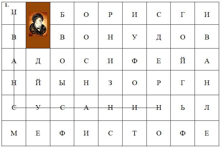 В сканворде зашифрованы различные слова, связанные с творчеством певца Фёдора Ивановича Шаляпина. Вам нужно будет вспомнить, какие роли сыграл знаменитый исполнитель в операх. Под сканвордом расположены вопросы-подсказки к этим словам. Найдите в сканворде слова, которые являются ответами на данные вопросы. Соедините слово-ответ линией, как показано на образце. Напишите рядом со словом-ответом номер вопроса, к которому оно относится.