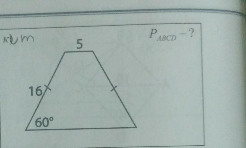 Если опустить высоту то маленький отрезок будет равен 8 см ( против угла 30 градусов) . Большее основание 8+5+8=21. Р=5+21+16*2=......