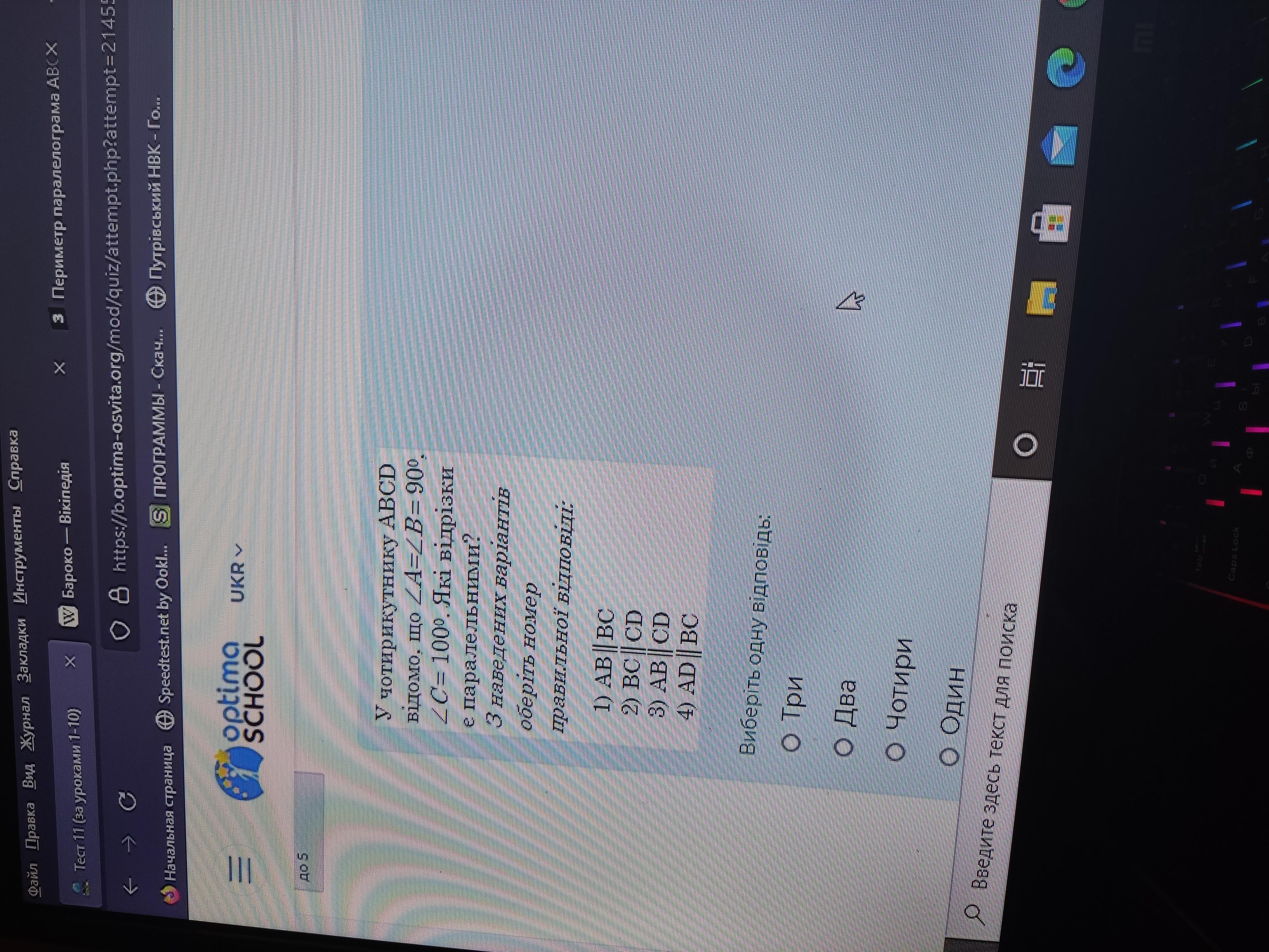 У чотирикутнику ABCD відомо, що кут A=куту B=90°,кут C=100°.Які відрізки є паралельними?