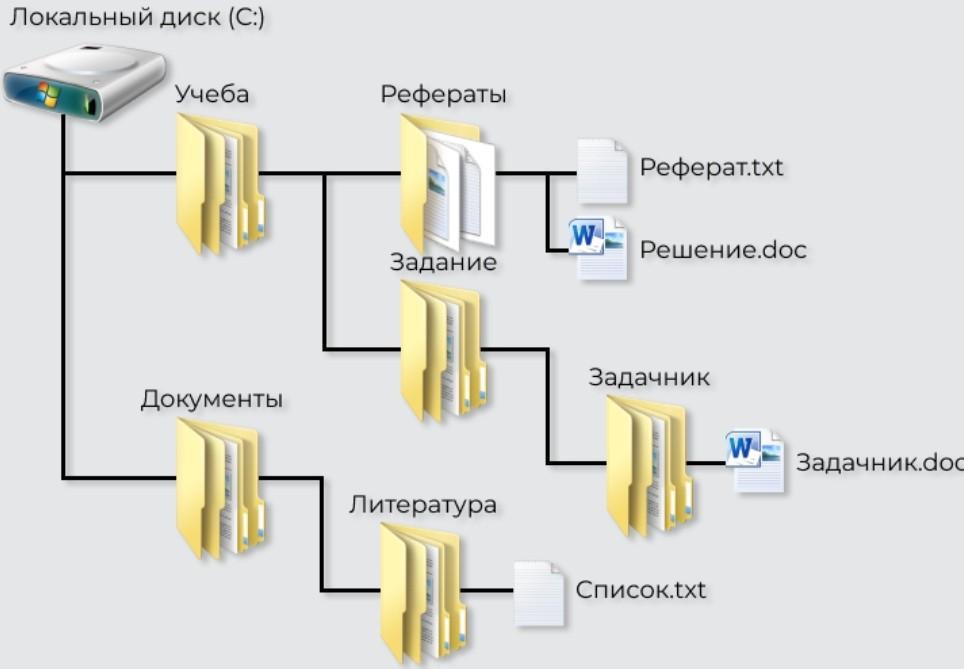 1) на диске С хранится папка учеба, в которой ещё две - "Рефераты" и "Задание". Нам нужна папка "Рефераты", так как в ней хранится документ Решение.doc