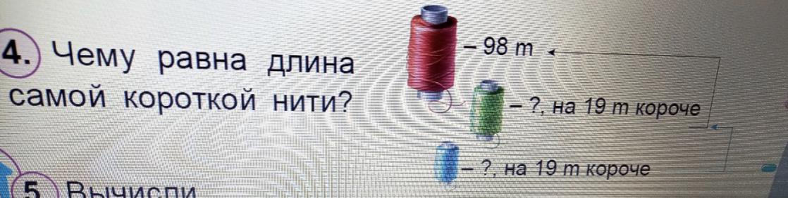 1)98-19=79(м)-длинна средней нити 2)79-19=60(м) Ответ:длинна самой короткой нити составляет 60метров