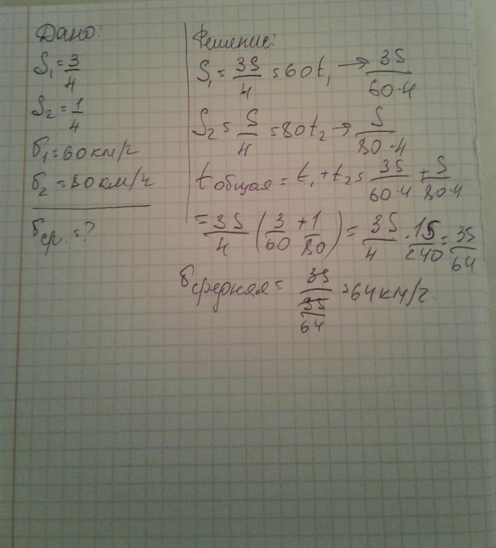 Три четверти пути автомобиль прошёл со скоростью 60 км/ч, а остальную часть пути - со скоростью 80 км/ч. Какова средняя скорость автомобиля?