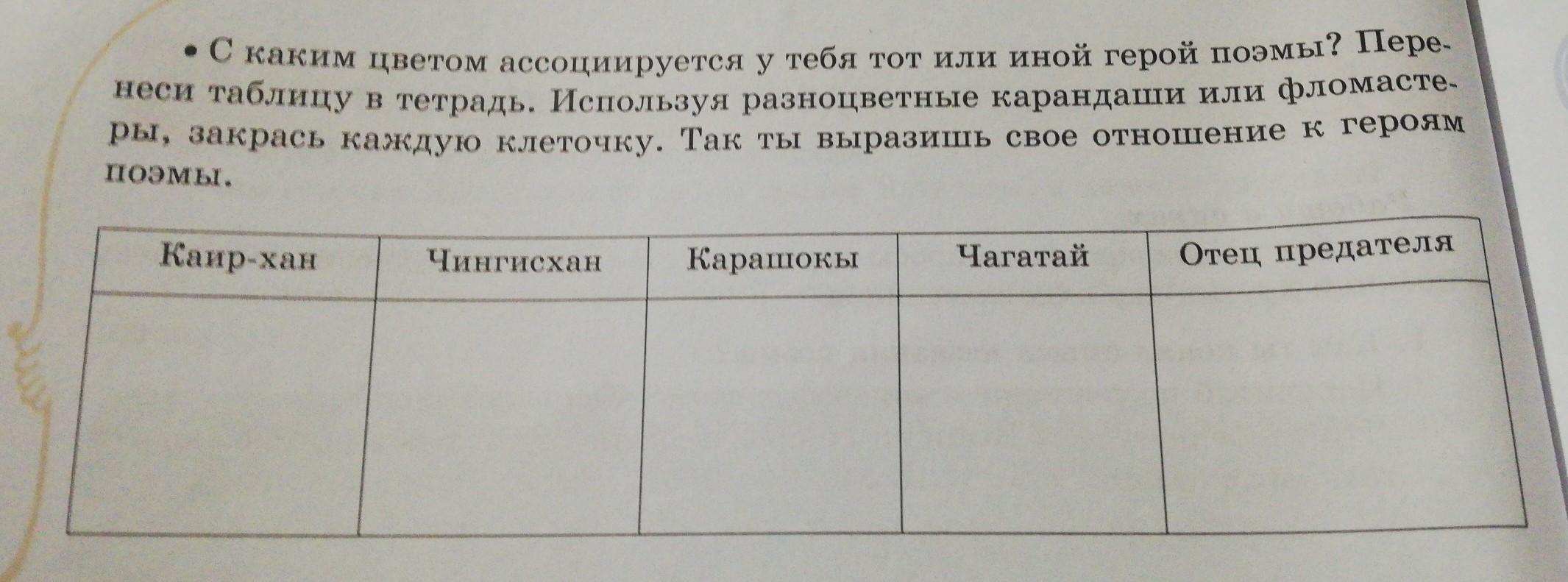 С каким цветом ассоциируется у тебя тот или иной герой поэмы перенесите таблицу в тетрадь и используя разноцветные карандаши или фломастеры раскрась каждую клеточку как ты что отношение к героям поэмы отрар