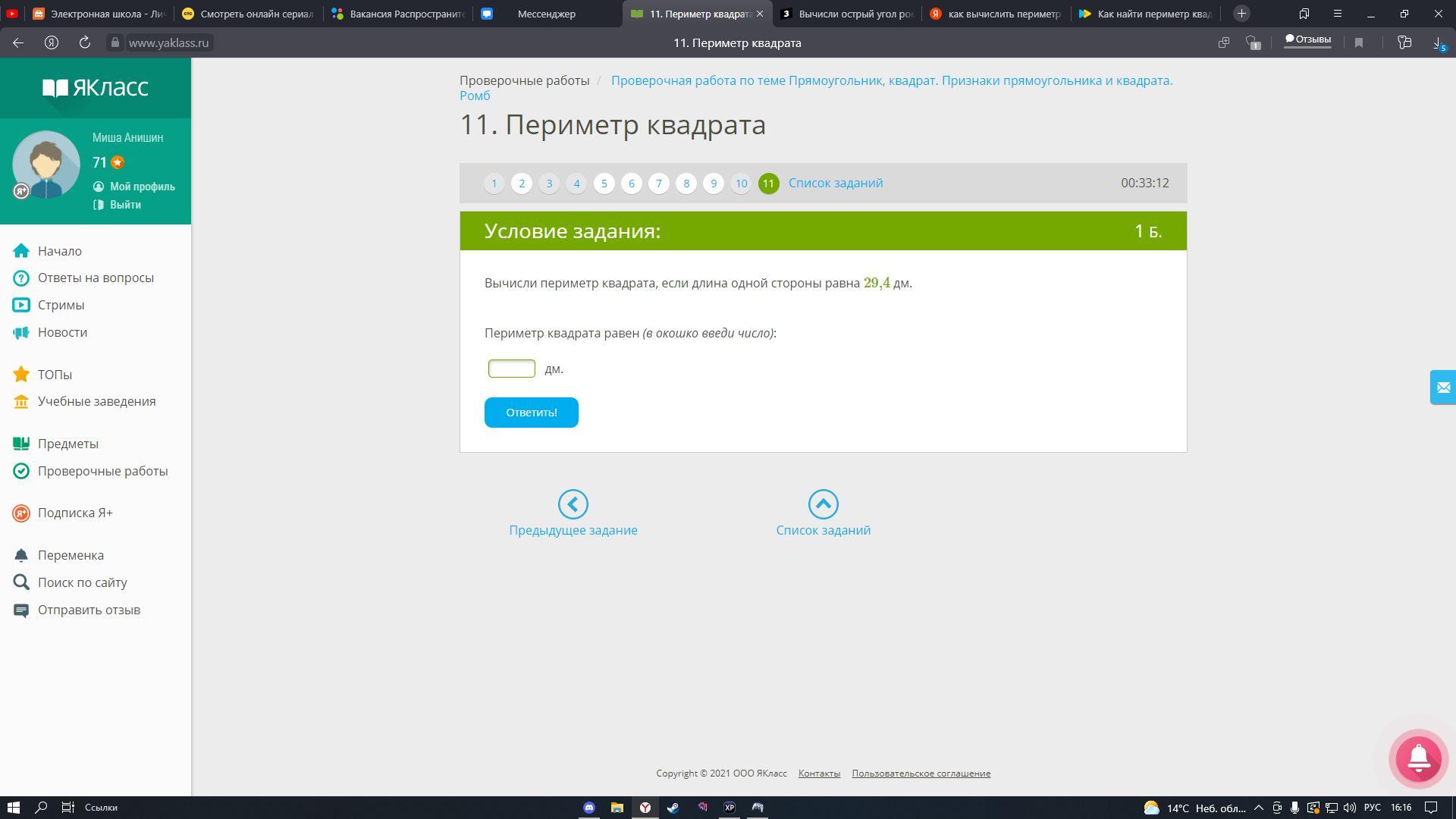 Квадрат - четырехугольник, у которого все стороны равны. Ответ: 117, 6 дм.