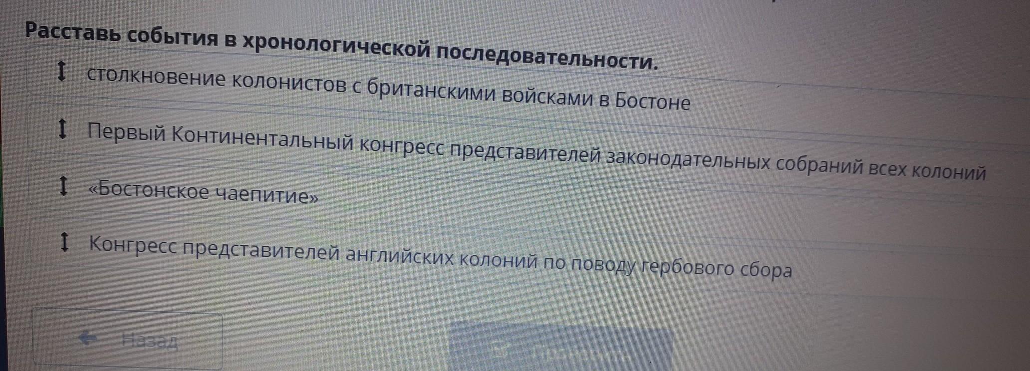Расставь события в хронологической последовательности. I столкновение колонистов с британскими войсками в Бостоне 1 Первый Континентальный конгресс представителей законодательных собраний всех колоний І «Бостонское чаепитие» I Конгресс представителей английских колоний по поводу гербового сбора