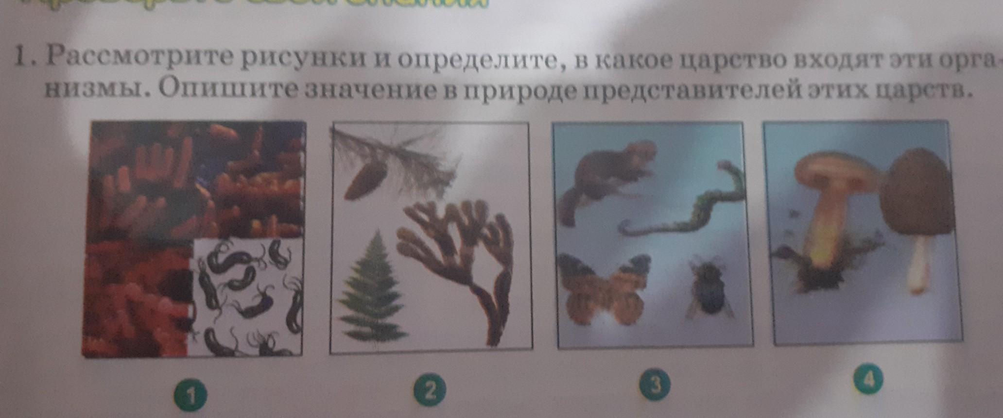 1. Рассмотрите рисунки и определите, в какое царство входят эти орта низмы. Опишите значение в природе представителей этих царев