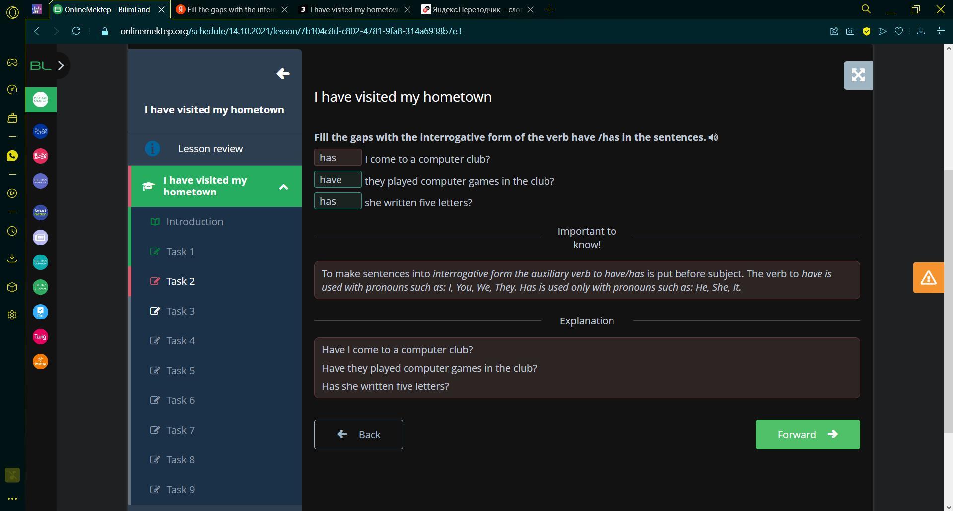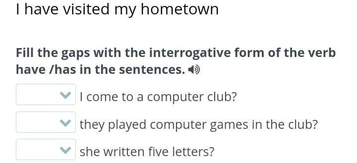 I have visited my hometown Fill the gaps with the interrogative form of the verb have /has in the sentences. I come to a computer club? they played computer games in the club? she written five letters? Back Check