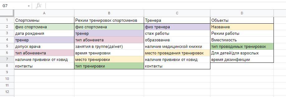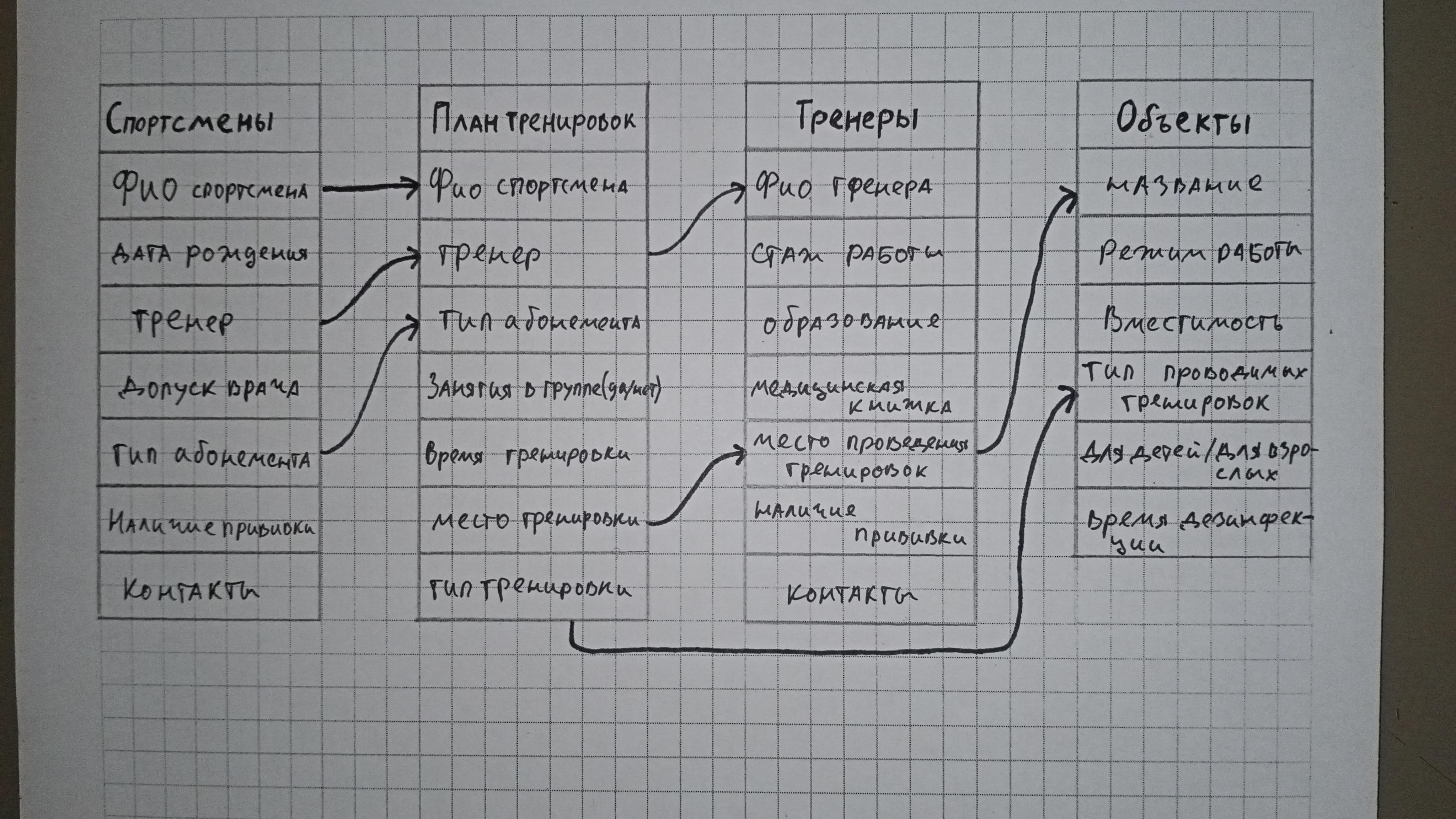 Спроектируйте структуру БД «Спортивный клуб». Данные нужно организовать в виде четырёх таблиц. Каждая таблица должна содержать не менее пяти полей с различными типами данных. Недостающие данные необходимо придумать самостоятельно. Покажите связи и отношения между таблицами.