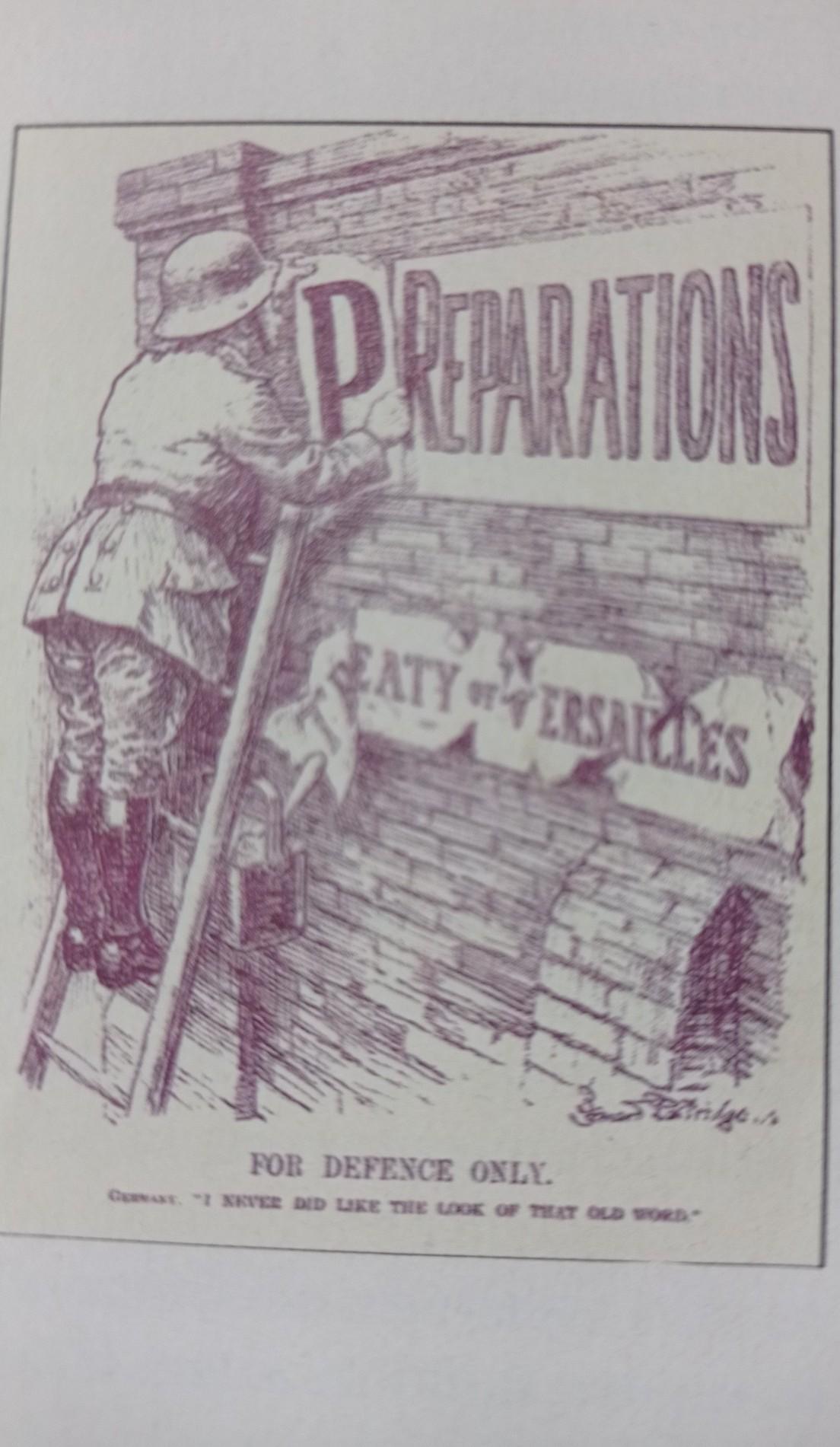 Тільки для оборони. Німеччина. "Мені ніколи не подобався вигляд цього старого слова". (Німецький солдат у чобітках вставляє букву П перед словом Репарації для написання підготовки, тоді як старий афіша Версальського договору пошарпана і падає зі стіни)