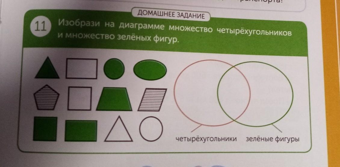 в часть красного круга, то есть слева, ты зарисовываешь просто четырехугольники, а в часть зеленого круга ты зарисовываешь зеленые фигуры (не четырехугольники!), а по середине, то есть в красном и в зеленом кругах ты зарисовываешь зеленые четырехугольники