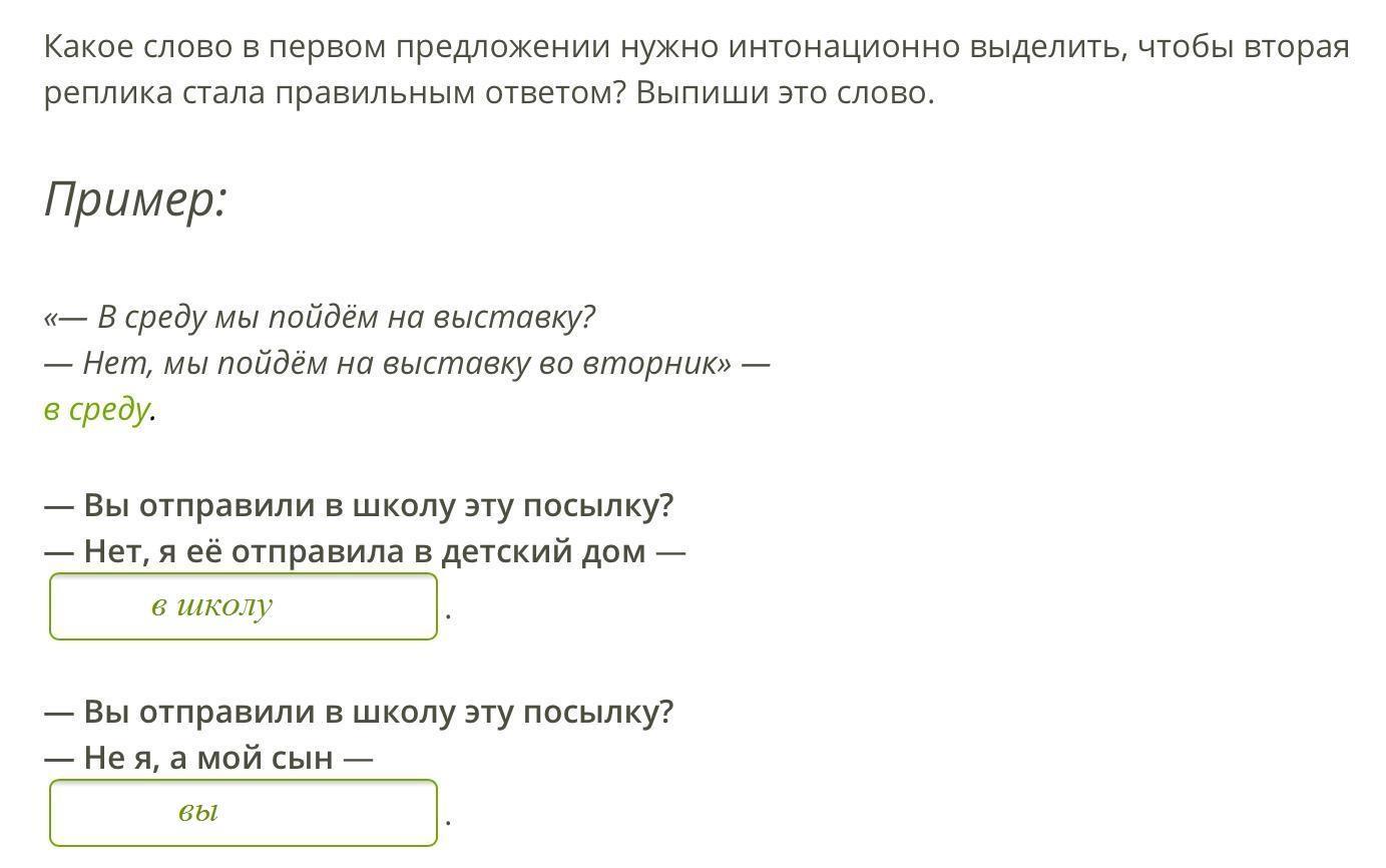 Какое слово в первом предложении нужно интонационно выделить, чтобы вторая реплика стала правильным ответом? Выпиши это слово.