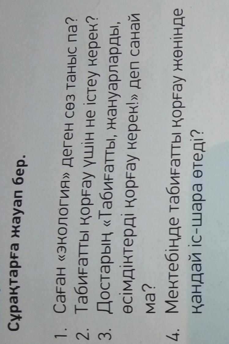 1)Әрине,маған экология сөзі таныс.Элогия деген-жеке организмнің қоршаған ортамен қарым-қатынасын, ортаға бейімделу заңдылықтарын, сондай-ақ организм деңгейінен жоғарырақ тұрған биологиялық жүйелердің – популяциялардың, организмдер қауымдастықтарының, экожүйелердің, биосфераның ұйымдастырылу және қызмет атқару заңдылықтарын зерттейтін ғылым.