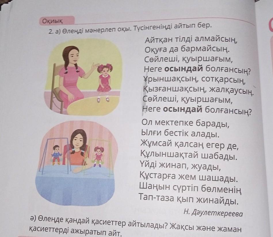 өлеңде жақсы және жаман қасиеттер туралы айтылып тұр. Жақсы қасиет деген ол айтқан тілді алатын, үйді жинап жуатын адам. Ал жаман қасиет ол айтқан тілді алатын үйді реттемейтін адам.