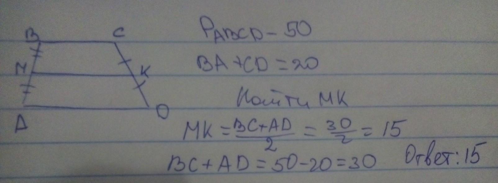 ПОМОГИТЕ ПОЖАЛУЙСТА(ЖЕЛАТЕЛЬНО ФОТО) 4. Периметр трапеции равен 50 см, а сумма непараллельных сторон равна 20 см. Найдите среднюю линию трапеции.