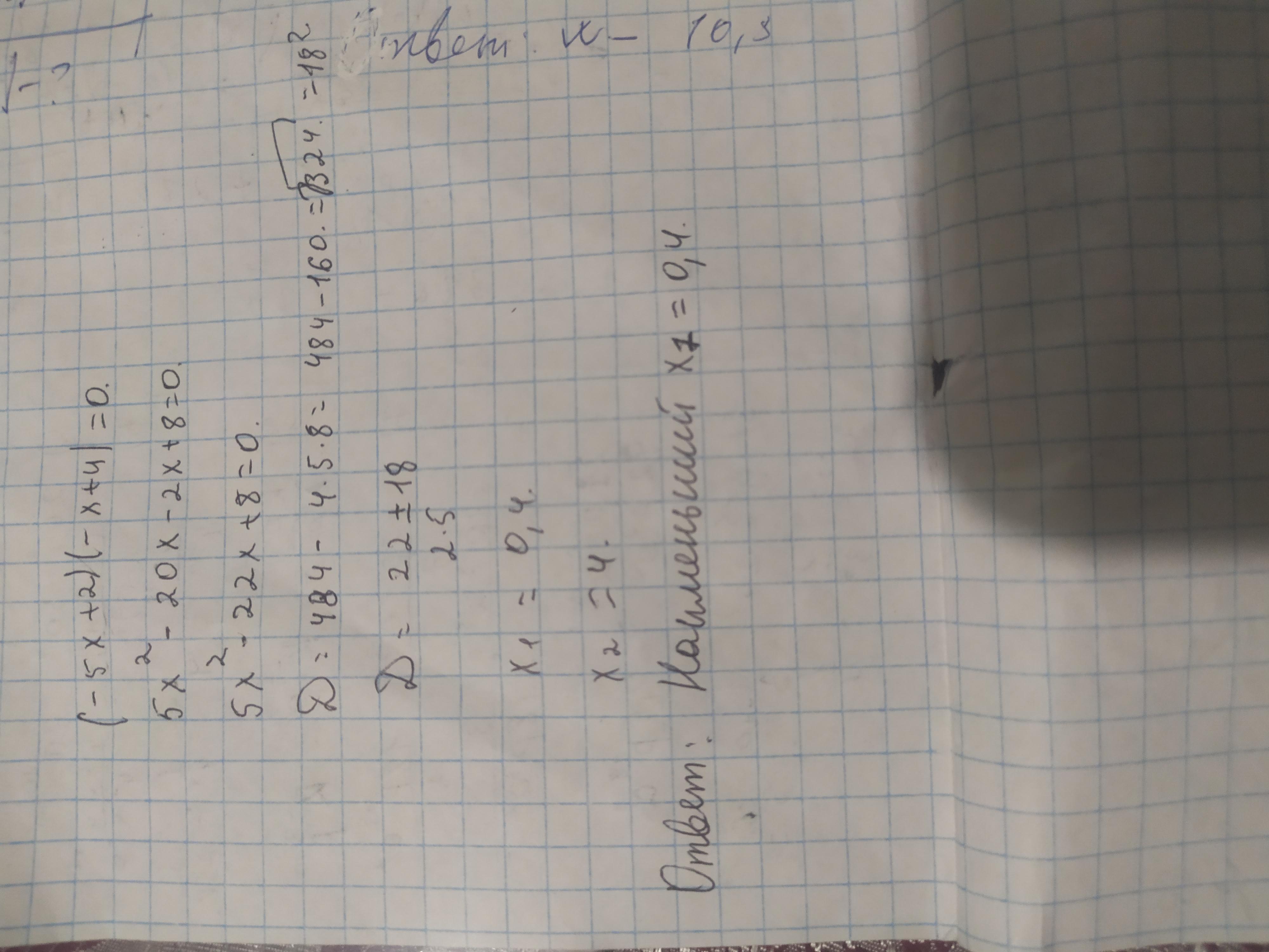 Решите уравнение (-5x+2)(-x+4)=0 Если уравнение имеет более одного корня, в ответ запишите меньший из корней