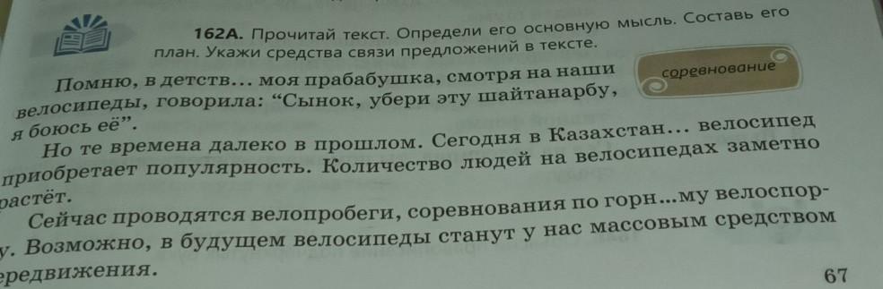 Прочитай текст. Определи его основную мысль. Составь его план. Укажи средства связи предложений в тексте. Помню, в детств... моя прабабушка, смотря на наши велосипеды, говорила: "Сынок, убери эту шайтанарбу, соревнование я боюсь её". Но те времена далеко в прошлом. Сегодня в Казахстан... велосипед приобретает популярность. Количество людей на велосипедах заметно растёт. Сейчас проводятся велопробеги, по горн... му велоспор- ту. Возможно, в будущем велосипеды станут у нас массовым средством передвижения.