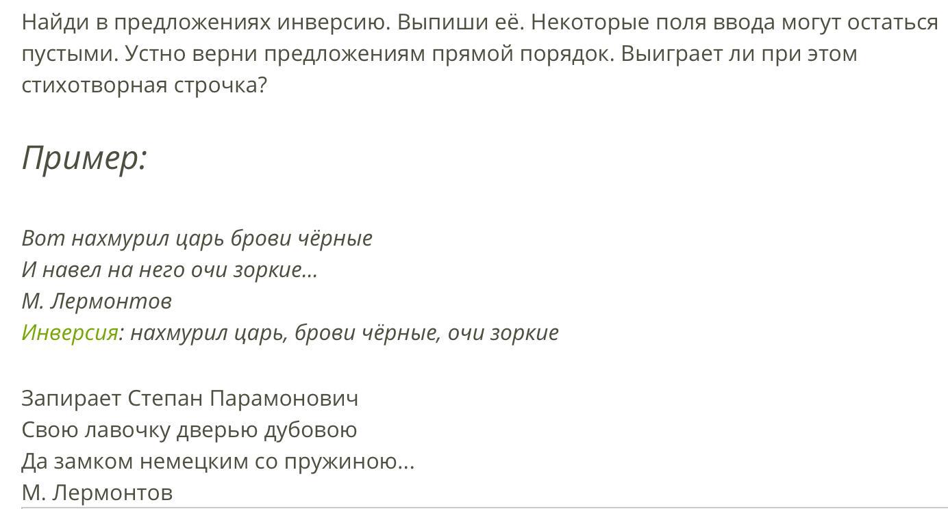 Найди в предложениях инверсию. Выпиши её. Некоторые поля ввода могут остаться пустыми. Устно верни предложениям прямой порядок. Выиграет ли при этом стихотворная строчка?