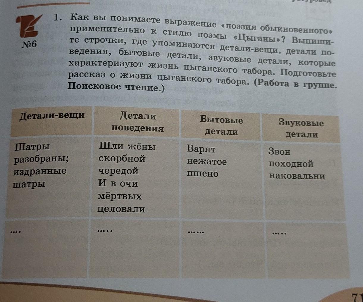 Выпишите строчки где упоминаются детали, вещи, детали поведения,бытовые детали звуковые детали, которые характеризуют жизнь цыганского табора. Подготовьте рассказ о жизни цыганского табора.