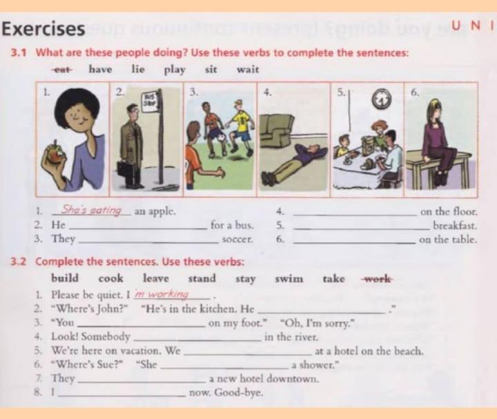 2)’Where’s John?’ ‘He’s in the kitchen. He is cooking.3)’You are standing on my foot.’ ‘Oh, I’m sorry.’4)Look! Somebody is swimming in the river.5)We’re here on holiday. We are staying at the Central Hotel.6)’Where’s Sue?’ ‘She is having a shower’.7)They are building a new hotel in the city centre at the moment.8)I am going now. Goodbye.